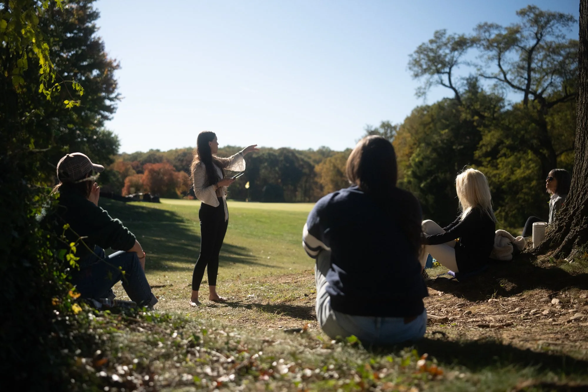 Kate guiding a meditation for the trees & birds of Rock Creek, photographed by @itakeshots